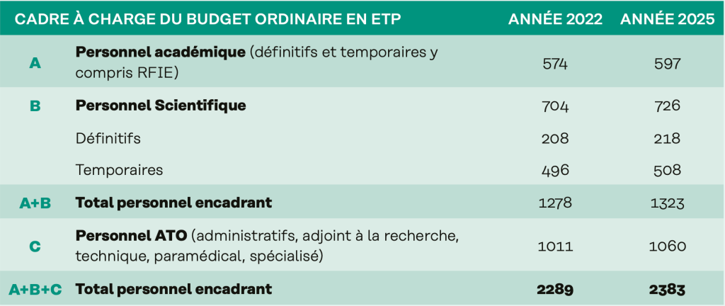 - Une réadaptation sereine des effectifs sur base des besoins réels au niveau de chaque faculté. La redistribution des 5/5 aux facultés depuis 2022 a permis un rattrapage des déficits d’encadrement du passé (pour rappel, restitution des assistants « recteur », remplacement de 2 pour 3 départs, puis de 4 pour 5, calcul sur base du coût lissé fin de carrière), et une augmentation des effectifs de toutes les catégories, comme le montre le tableau (page suivante), avec un nombre relativement constant d’étudiant·es.